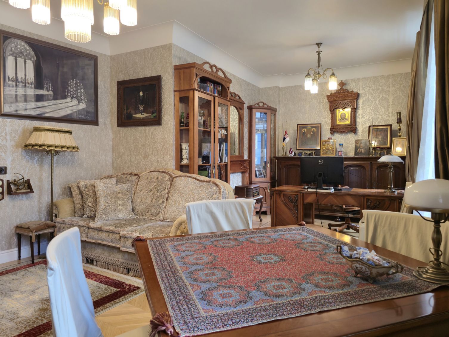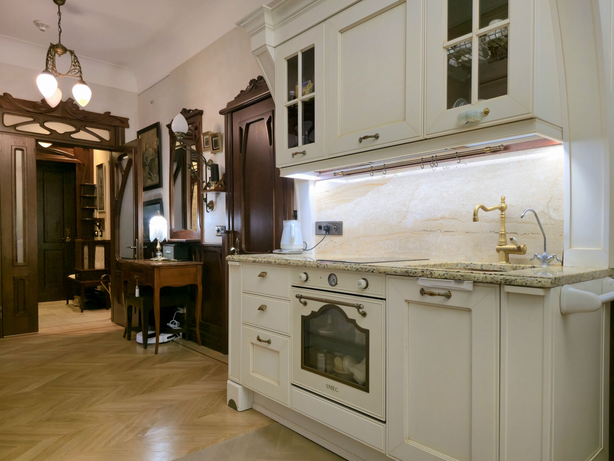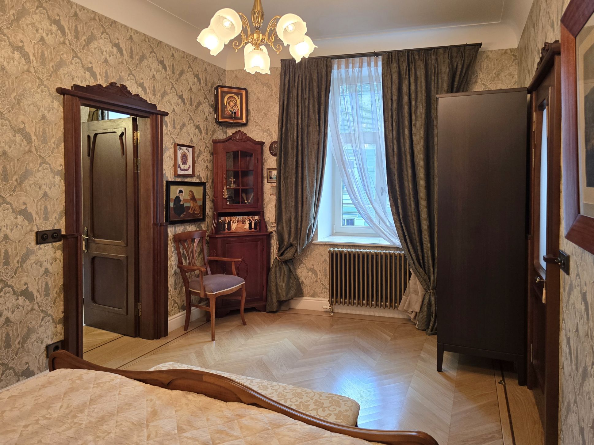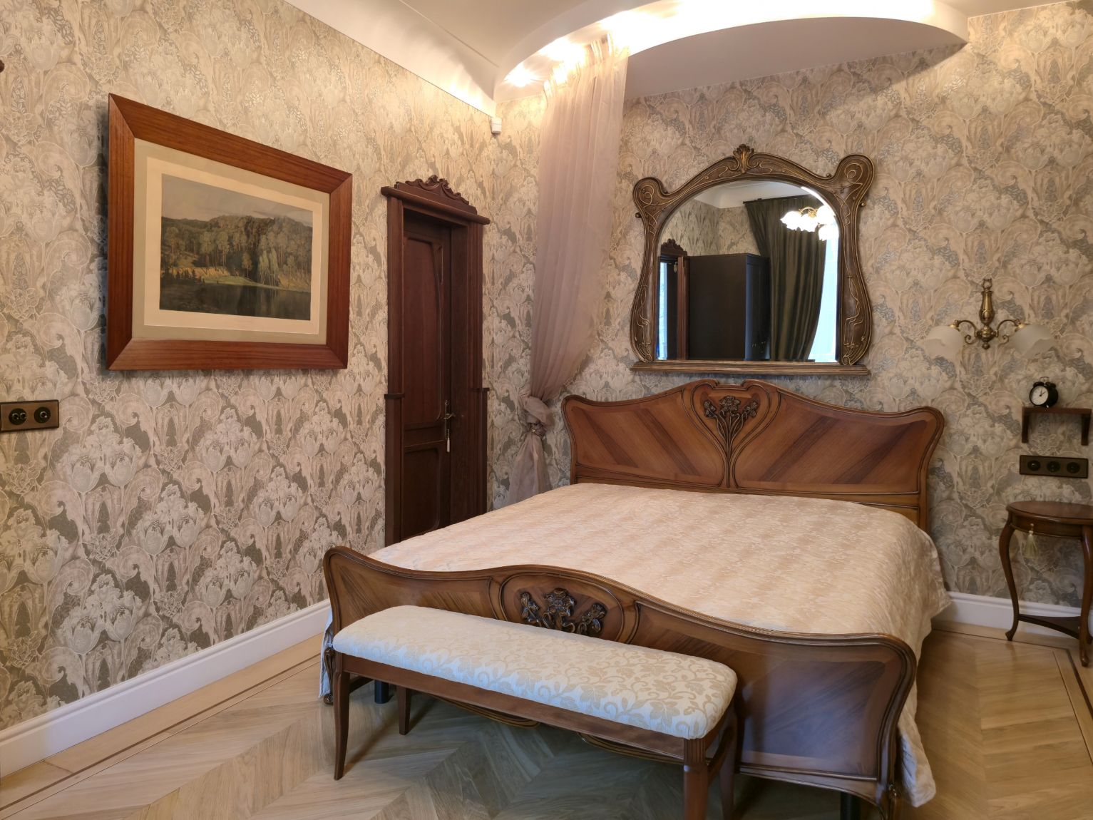 Dzīvoklis ir pilnībā renovēts un mēbelēts. Lustras, mēbeles, parketa grīdas un elektroinstalācija izgatavotas Itālijā un Vācijā, īpaši uzsverot to ekskluzivitāti. Durvis, koka paneļi gaitenī un virtuvē, kā arī daļa mēbeļu ir meistaru roku darbs.