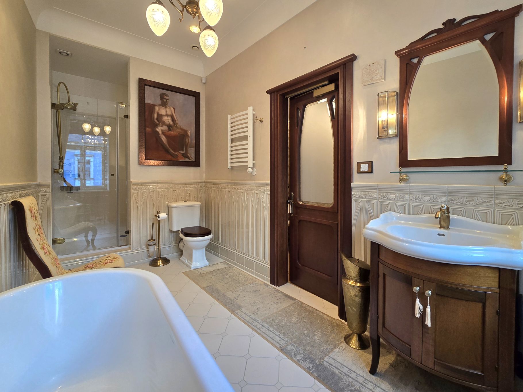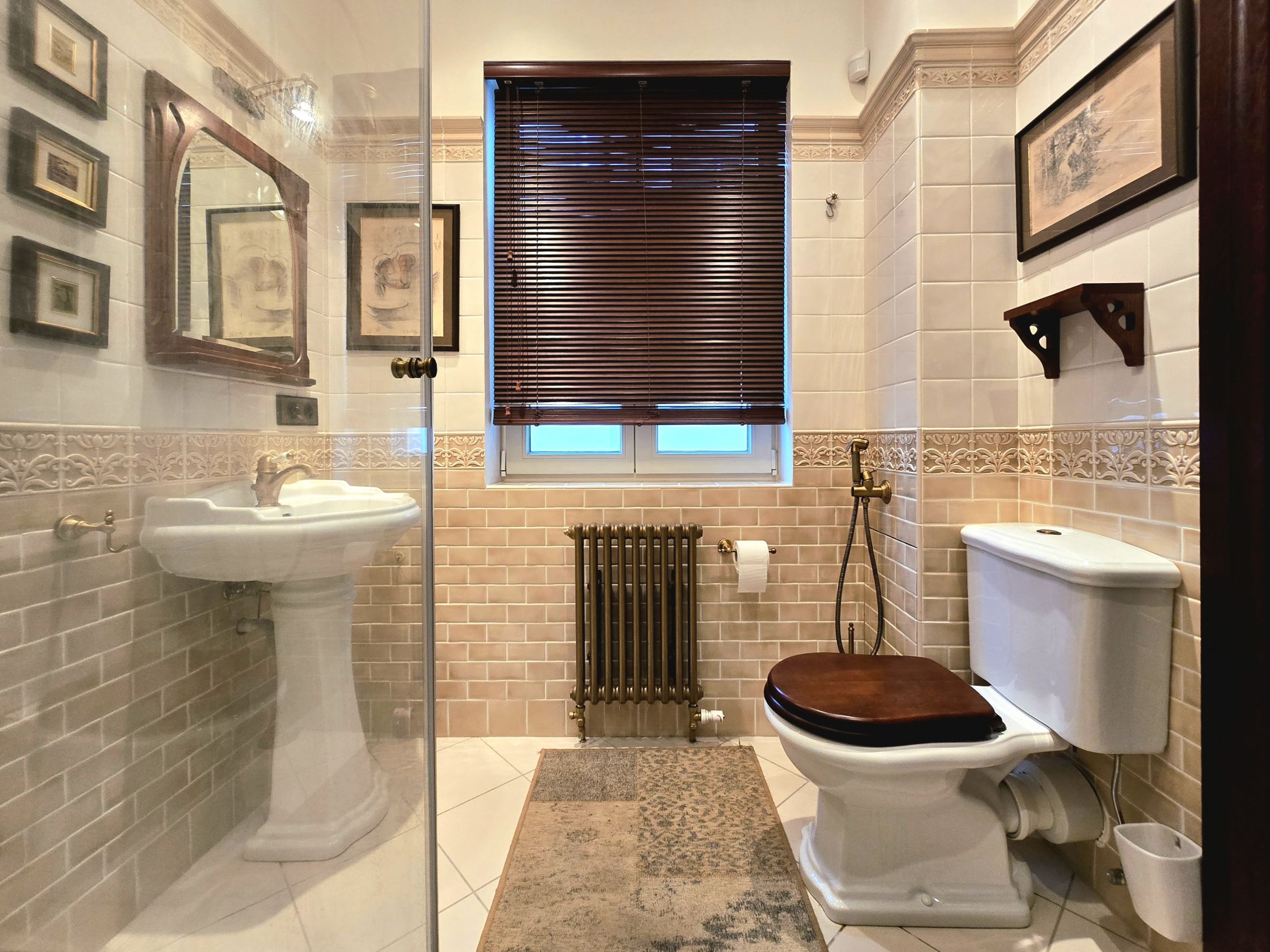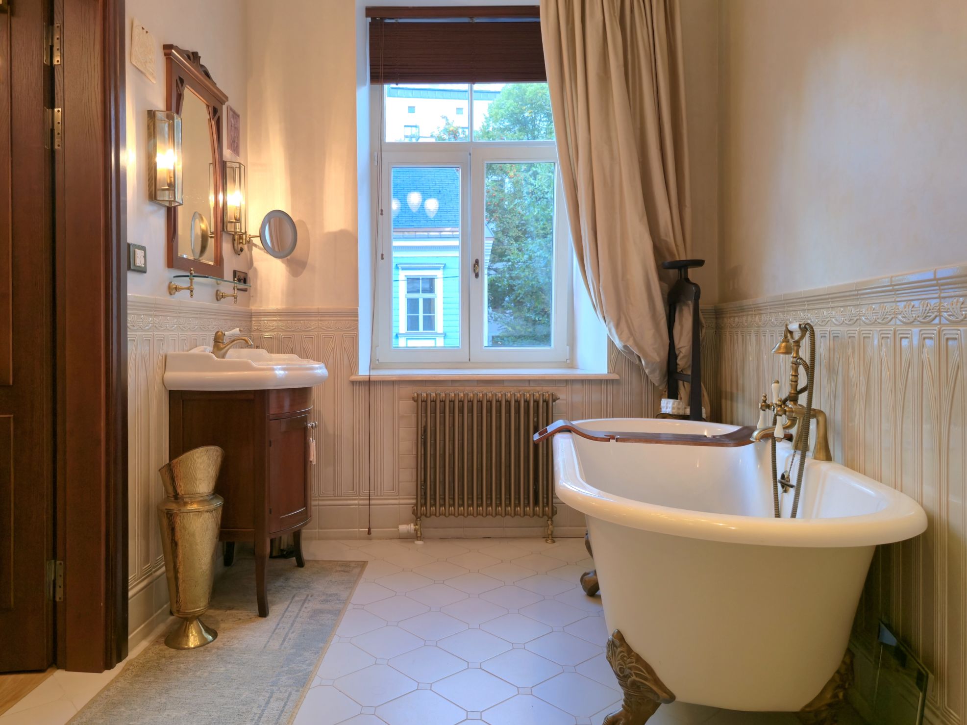 Flīzes un radiatori nākuši no rūpnīcas, kas šo māju aprīkoja vēl pagājušā gadsimta sākumā.